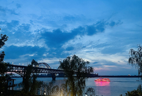 依江望庐,滔滔江水依旧,浔阳江头夜送客的身影已不在。入夜的灯火阑珊,凭栏远望,城市的光和皎洁的月交相辉映。映衬着江畔的我,从漫天晚霞看到华灯初上。也映衬着畅游在“浔阳江号”游轮上的你,从江上暮色看岸边璀璨灯火,浪漫又惬意。星辰大海中是茫茫九派的浔阳千古文化。恍惚间,仿佛仍能听到那曲嘈嘈切切的琵琶声……
