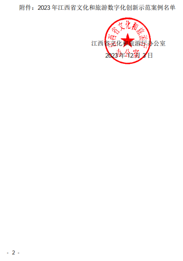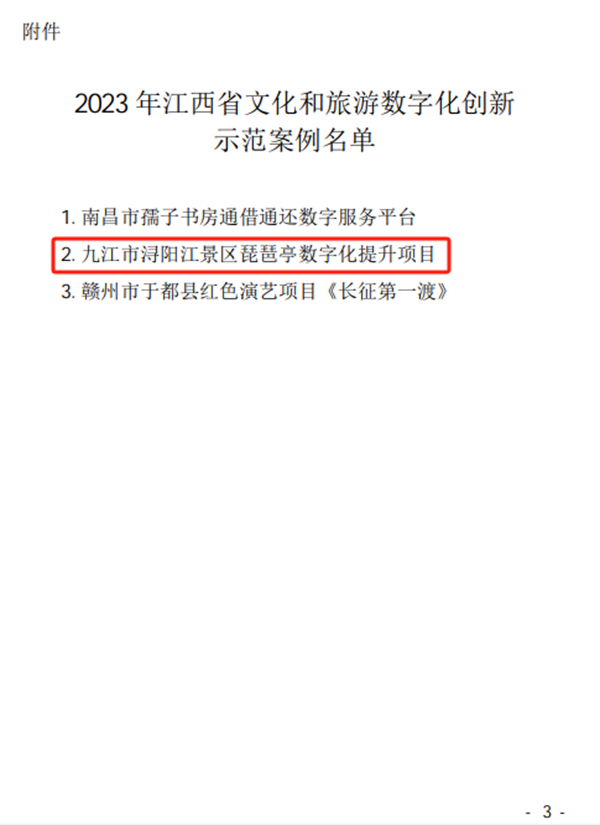 江西省文化和旅游厅办公室近日印发通知,发布2023年江西省文化和旅游数字化创新示范案例。其中,由市文旅集团申报的“九江市浔阳江景区琵琶亭数字化提升项目”成功荣获2023年江西省文化和旅游数字化创新示范案例。